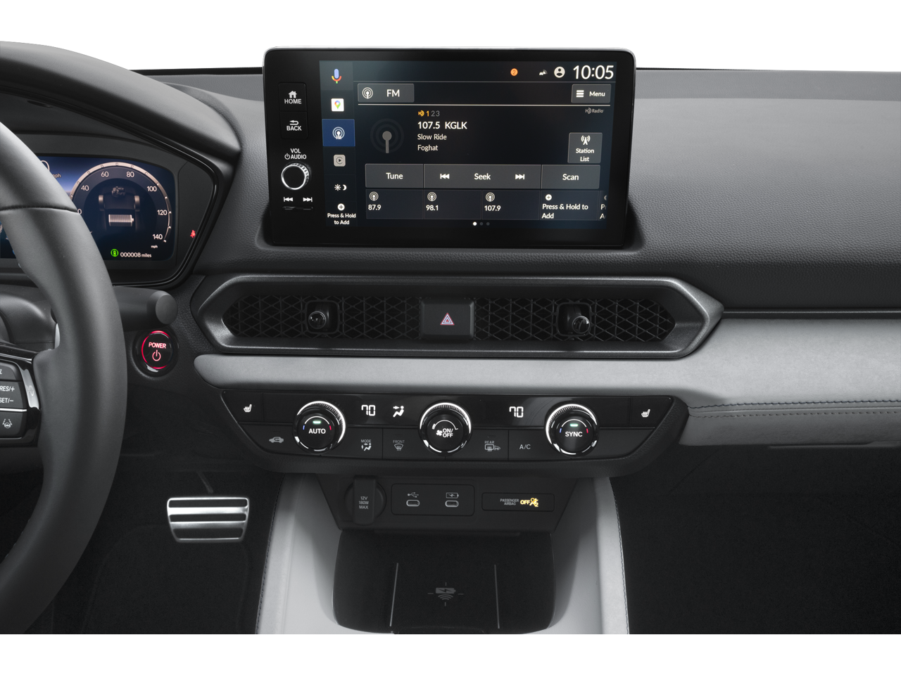 - Radio: Bose Premium Sound System -inc: 8 speakers w/subwoofer, 9" color touchscreen, Google and Alexa Built-in (includes 3 years unlimited data plan for in-vehicle apps), Bluetooth® HandsFreeLink and streaming audio, HondaLink, Speed-Sensitive Volume Compensation (SVC), Radio Data System (RDS), wireless Apple CarPlay and wireless Android Auto compatibility, USB-C 3.0A smartphone/audio interface and charging port, 12-volt power outlet, HD Radio and wireless phone charger