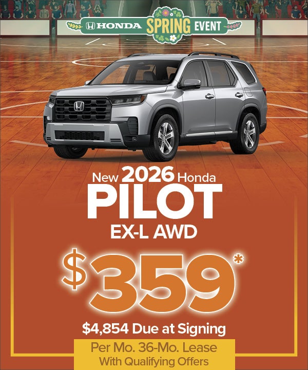 Vin# TB011628, auto. MSRP $48,890. $4,854 total due at lease signing ($3,900 cash down + $595 bank fee + 1st payment). Cap cost reduction, $5,150. TTL Lease/TTL Cost/Residual: $12,564/$17,419/$32,267.40. No security deposit required. Price(s) include(s) all costs to be paid by a consumer, except for licensing costs, registration fees, and taxes. Dealer doc fee of $999 not included in price. On approved credit through American Honda Finance. Residency restrictions may apply. Lease include 7.5K miles per year/$.20 per mile thereafter. $350 lease termination fee due at lease end. $1,250 Loyalty/Conquest Offer available toward cap cost reduction with the lease of a new 2026 Pilot available to current owners of any 2011 or newer Honda, Chevrolet, Ford, Hyundai, Jeep, Kia, Mazda, Nissan, Subaru, Tesla, Toyota and Volkswagen vehicles. Photos are for illustration purposes only.