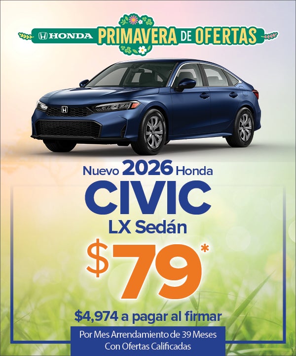 VIN# TH550622, automático. MSRP $25,790. $4,974 en total a pagar al firmar el contrato de arrendamiento ($3,900 de pago inicial en efectivo + tarifa bancaria de $995 + primer pago). Reducción de costos de tope, $4,400. Arrendamiento TTL/Costo TTL/Residual: $3,081/$7,976/$19,600.40. No se requiere depósito de seguridad. Los precios incluyen todos los costos que debe pagar el consumidor, excepto los costos de licencia, tarifas de registro e impuestos. Tarifa de documentación del concesionario de $999 no incluida en el precio. Con crédito aprobado a través de Visions FCU. Pueden aplicarse restricciones de residencia. El contrato de arrendamiento incluye 7,500 millas por año/$0.20 por milla a partir de entonces. Cargo por terminación del contrato de arrendamiento de $450 al finalizar el contrato de arrendamiento. Oferta de fidelidad/captación de clientes de $500 disponible para la reducción del coste inicial al arrendar un nuevo Civic 2026, válida para los propietarios actuales de cualquier vehículo Honda, Chevrolet, Ford, Hyundai, Jeep, Kia, Mazda, Nissan, Subaru, Tesla, Toyota y Volkswagen fabricado a partir de 2011. Las fotos son sólo para fines ilustrativos. La oferta vence el 4/5/2026.