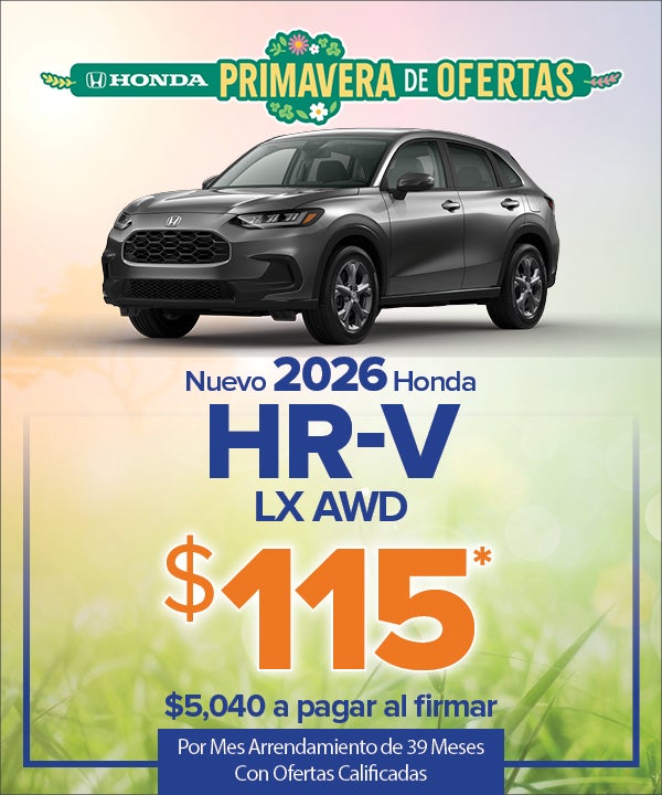 VIN# TM727501, automático. MSRP $29,150. $5,010 en total a pagar al firmar el contrato de arrendamiento ($3,900 de pago inicial en efectivo + tarifa bancaria de $995 + primer pago). Reducción de costos de tope, $4,650. Arrendamiento TTL/Costo TTL/Residual: $4,485/$9,380/$21,862.50. No se requiere depósito de seguridad. Los precios incluyen todos los costos que debe pagar el consumidor, excepto los costos de licencia, tarifas de registro e impuestos. Tarifa de documentación del concesionario de $999 no incluida en el precio. Con crédito aprobado a través de Visions FCU. Pueden aplicarse restricciones de residencia. El contrato de arrendamiento incluye 7,500 millas por año/$0.20 por milla a partir de entonces. Cargo por terminación del contrato de arrendamiento de $450 al finalizar el contrato de arrendamiento. Oferta de fidelidad/captación de clientes de $750 disponible para la reducción del coste inicial al arrendar un nuevo HR-V 2026, válida para los propietarios actuales de cualquier vehículo Honda, Chevrolet, Ford, Hyundai, Jeep, Kia, Mazda, Nissan, Subaru, Tesla, Toyota y Volkswagen fabricado a partir de 2011. Las fotos son sólo para fines ilustrativos. La oferta vence el 4/5/2026.